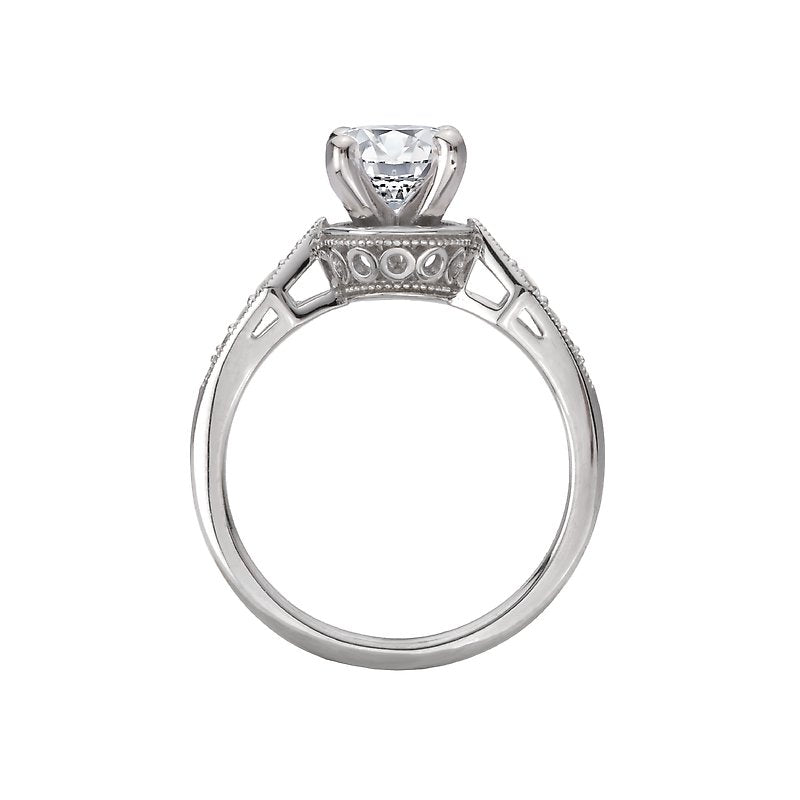 Elevate your love story with this exquisite 14kt white gold diamond engagement ring. Inspired by the timeless art deco era, this Bandora piece features a stunning milgrain design and round diamonds on either side of the center setting, creating a captivating allure. The semi-mount design is perfect for accommodating a 9x6.5mm oval shaped stone, adding a personal touch to your symbol of love. Crafted with precision and elegance, this ring is a true testament to Orbelle and sophistication. (D 1/8 carat total weight)