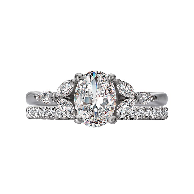 Elevate your love story with this exquisite 14kt white gold semi-mount engagement ring from the Orbelle collection. Featuring a trio of marquise diamonds on each side of a center setting, this Bandora piece is designed to accommodate a 7.5 x 5.5mm oval cut diamond (D 1/4 carat total weight). Crafted with precision and elegance, this ring is the perfect symbol of your timeless love.