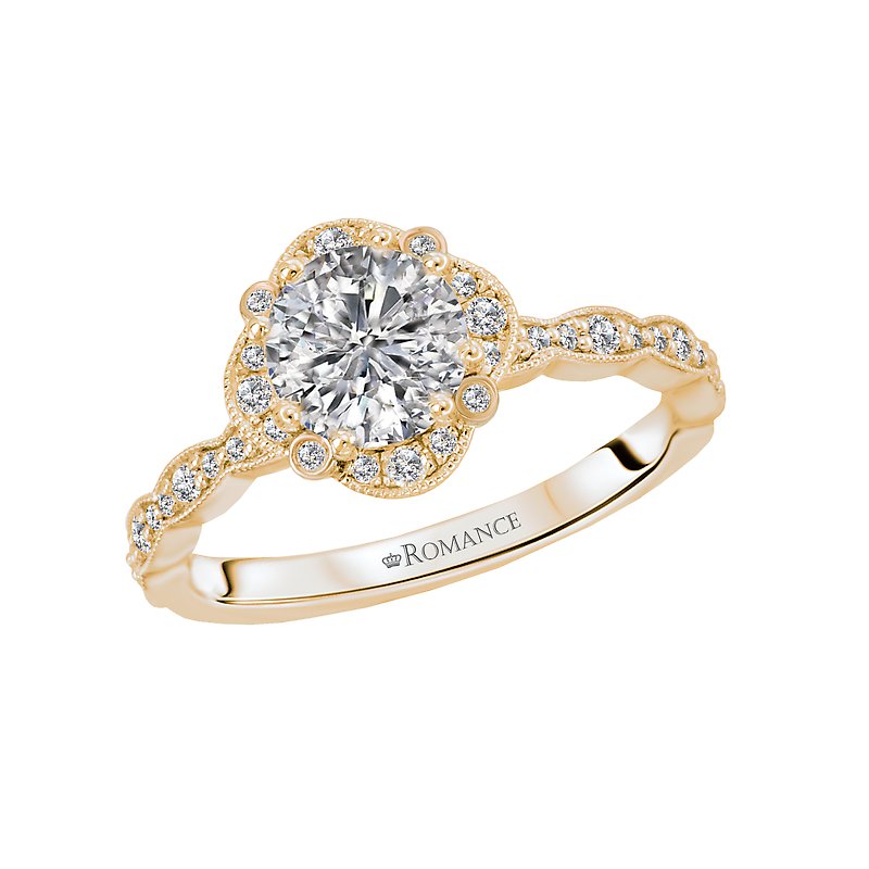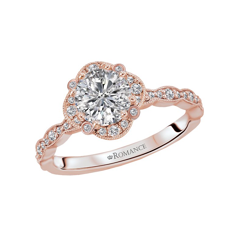 Enhance your love story with this exquisite 14K white and rose gold bridal ring. The captivating halo and scalloped band are adorned with delicate milgrain detail and round sparkling diamonds, totaling 1/4 carat in weight. This SEMI-MOUNT ring is designed to accommodate a 6x5mm round center stone, creating a timeless symbol of your everlasting love. Elevate your Orbelle with the Orbelle 14K collection's elegant and sophisticated style.