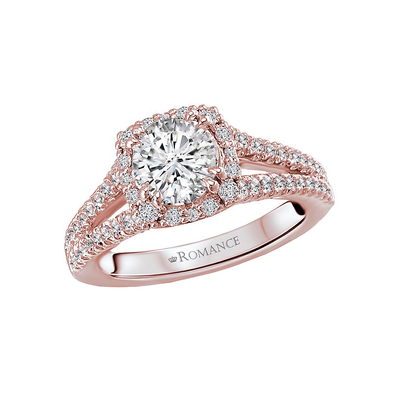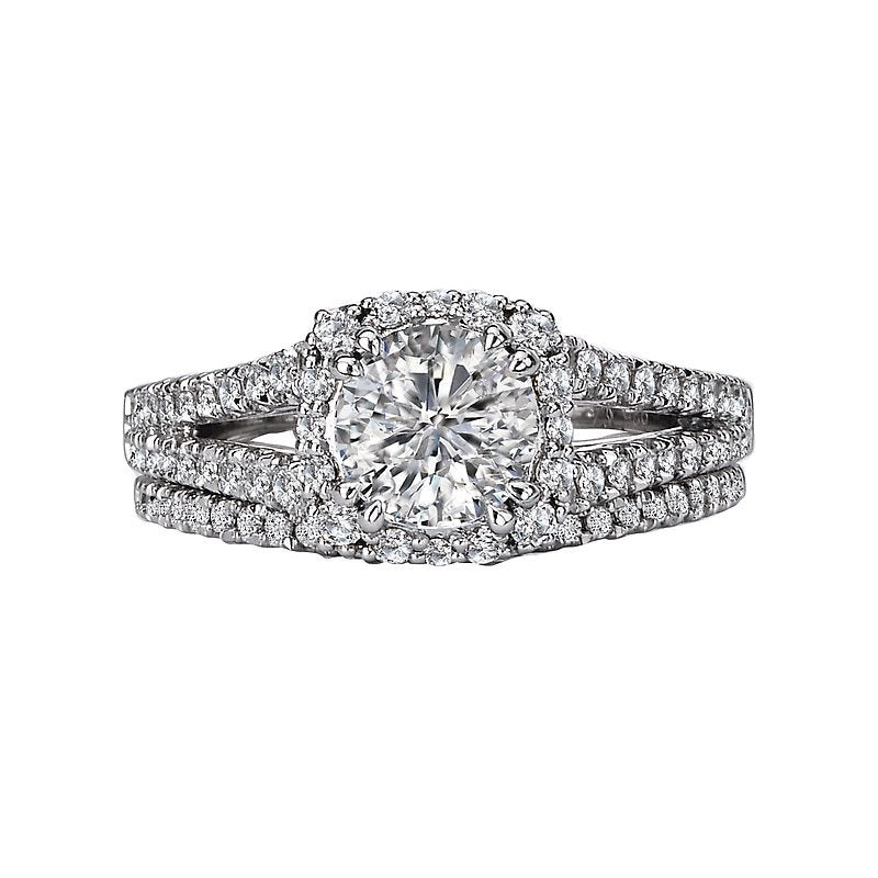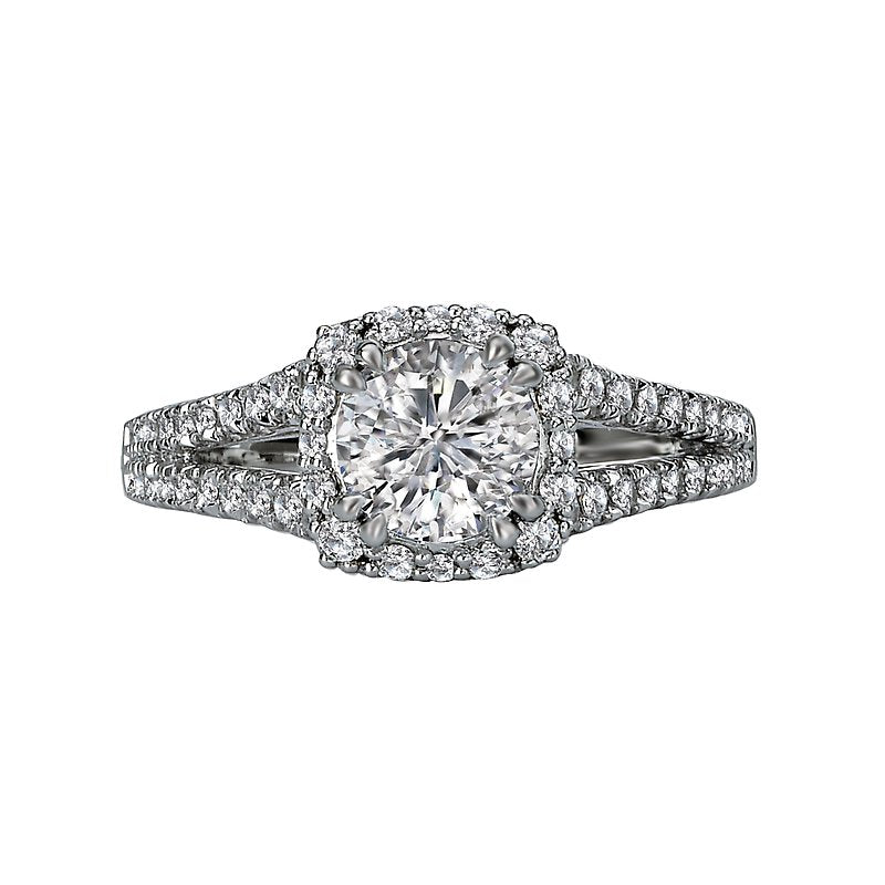 Elevate your style with this exquisite semi-mount ring crafted in 14k white gold, adorned with round faceted diamonds encircling the center stone and adorning the split shank. (D 5/8 carat total weight) This SEMI-MOUNT ring does not include a center stone, but it is designed to accommodate a 6.5mm round center stone, making it the perfect choice for creating a personalized and unique piece. The Orbelle 14K collection offers timeless elegance and sophistication, making this ring a stunning choice for engagement or special occasions.