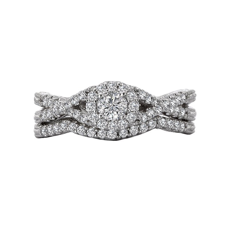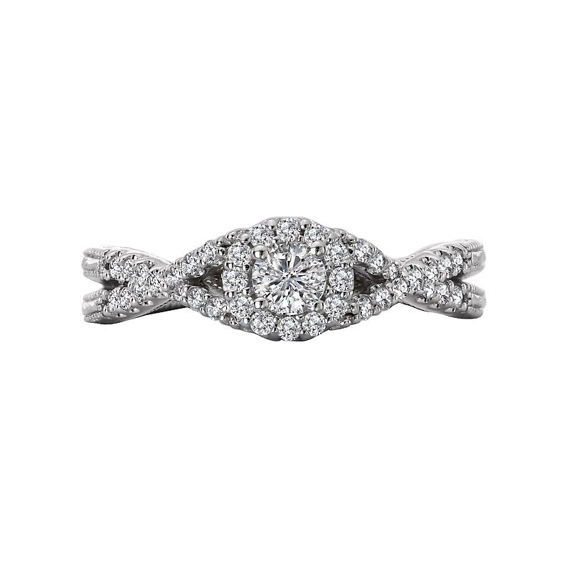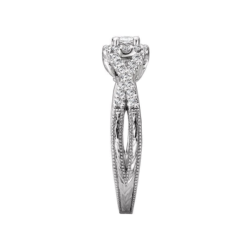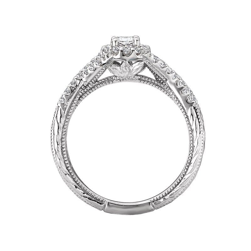 Elevate your bridal look with this exquisite Orbelle Petite semi-mount diamond ring. The intricate milgrain detail, round halo, and braided shank adorned with sparkling diamonds exude timeless elegance. Crafted in high polished 14K white gold, this ring is designed to accommodate a 3.4-3.8mm round center stone, making it the perfect choice for your dream engagement ring. (D 1/4 carat total weight)