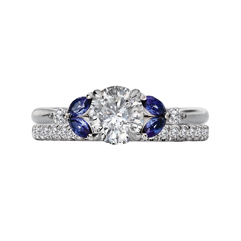 Elevate your love story with this exquisite 14kt white gold semi-mount engagement ring from the Orbelle collection. Featuring a trio of marquise sapphires and round diamonds on either side, this Bandora piece is designed to accommodate a 6.5mm round diamond at its center. The total weight of the diamonds is 0.06 carats, while the sapphires total 1/4 carat. Crafted with precision and elegance, this ring is the perfect symbol of your timeless love.