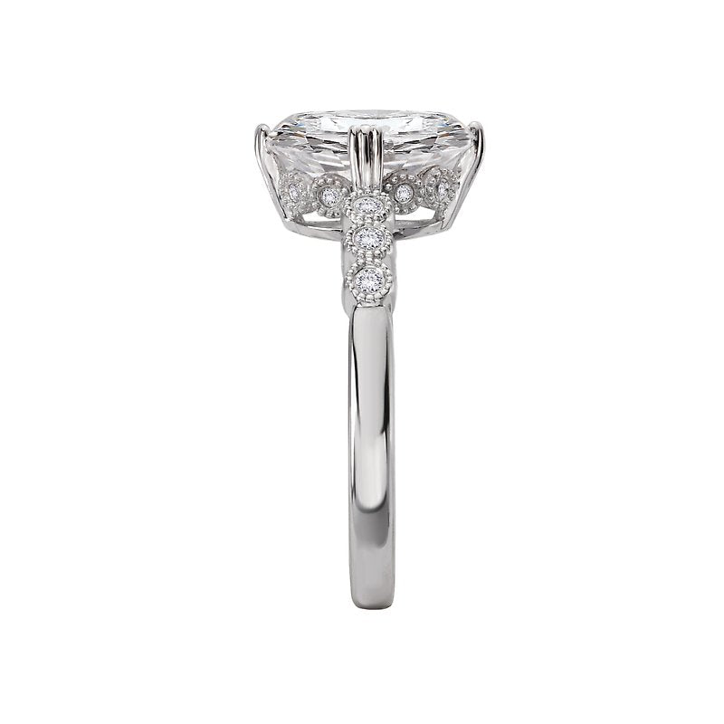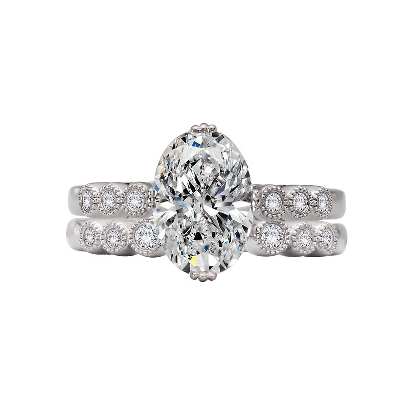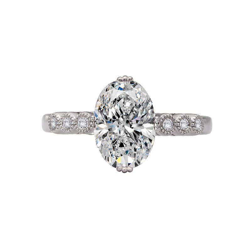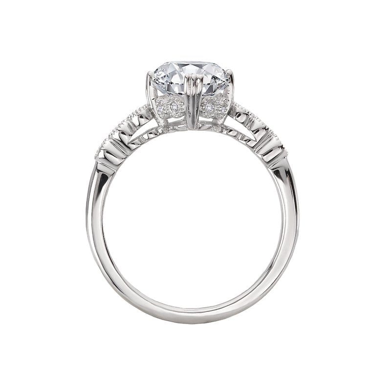 Elevate your love story with this exquisite Orbelle Triple Prong Diamond Engagement Ring. Crafted in 14kt white gold, this Bandora semi-mount ring features round diamonds and milgrain designs lining the shank on either side of a center setting that will accommodate a 10x7mm oval shaped stone. The D .084 carat total weight adds a touch of luxury to this timeless piece. Perfect for marking the beginning of your forever, this ring is a symbol of enduring love and commitment.