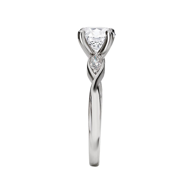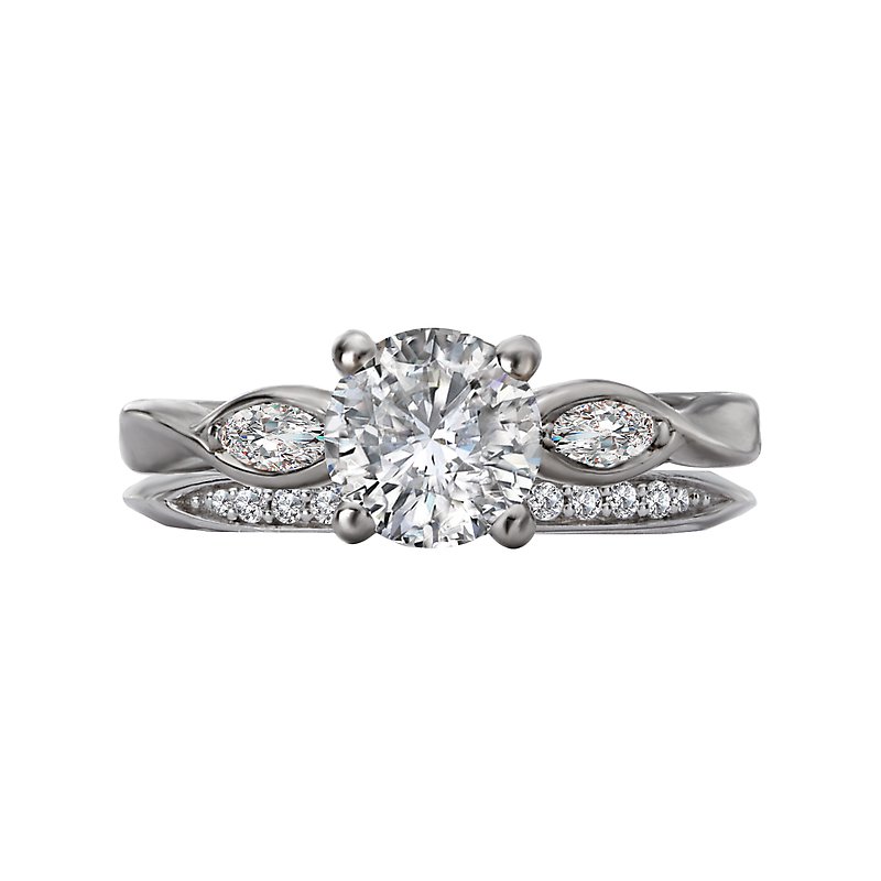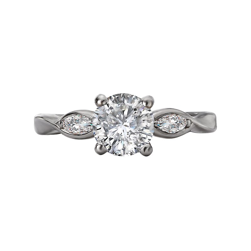 Elevate your love story with this exquisite Orbelle Green LGD 14kt white gold semi-mount engagement ring. Two marquise diamonds delicately nestled on either side of a setting that perfectly accommodates a 6.5mm round diamond (D 1/8 carat total weight). This Bandora piece exudes timeless elegance and sophistication, making it the perfect symbol of your everlasting commitment. Crafted with 14K white gold and adorned with a stunning white diamond, this ring is a true testament to exceptional craftsmanship and exquisite design. Make every moment memorable with this stunning piece that captures the essence of your love.