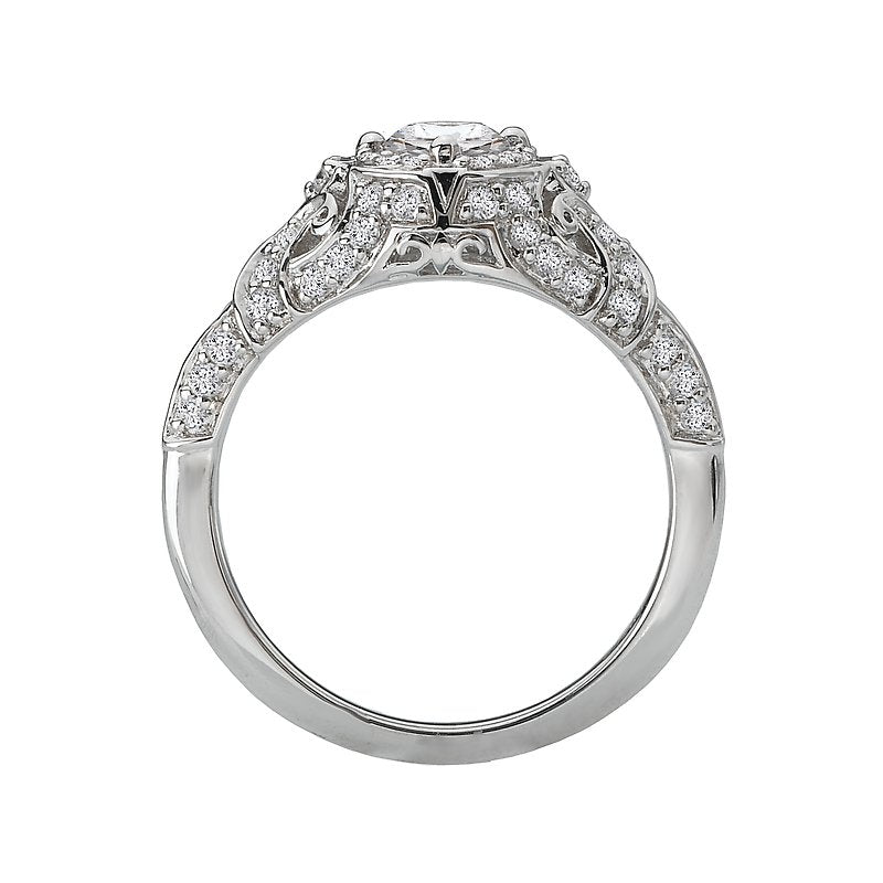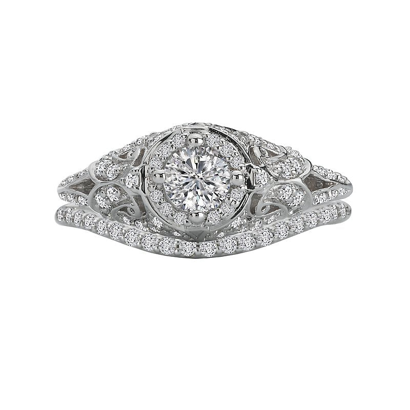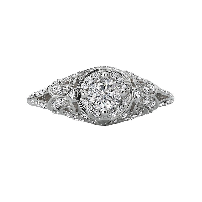 Indulge in timeless elegance with this vintage-style diamond engagement ring from the Orbelle Petite collection. Crafted in lustrous 14K white gold, this exquisite piece features a dazzling round center stone weighing 3/8 carats, surrounded by a total of 7/8 carats of white diamonds. The center stone, with a size of 4.6-5.2mm, exudes a Bandora charm, making it the perfect symbol of everlasting love. Whether it's a romantic proposal or a special occasion, this ring is a stunning choice for those who appreciate the finer things in life.