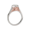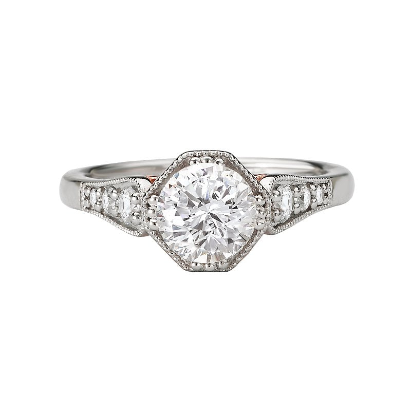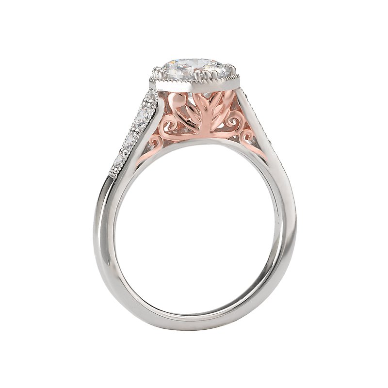 Elevate your love story with this vintage-inspired octagon shaped halo diamond ring. Crafted in exquisite 18K white and rose gold with delicate milgrain and side details, this semi-mount ring is designed to hold a 6.5mm round center stone (center stone not included). The total diamond weight is 1/5 carat, adding a touch of timeless elegance to your special moment.
